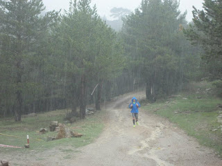 Corro, primero en los toboganes y falsos llanos, pero también en las primeras subidas de la Banyadera. Pero no todo es perfecto. El cielo se ha roto y cae todo sobre nosotros, me pongo el cortavientos, pero no sirve de nada, estoy empapado. Espera, algo más, granizo, empieza a caer piedra, que con el diluvio no es bastante. Cómo afecta el buen ánimo, casi no me importa... sigo apretando, ahora que la subida es más pronunciada andando pero a un ritmo alto.